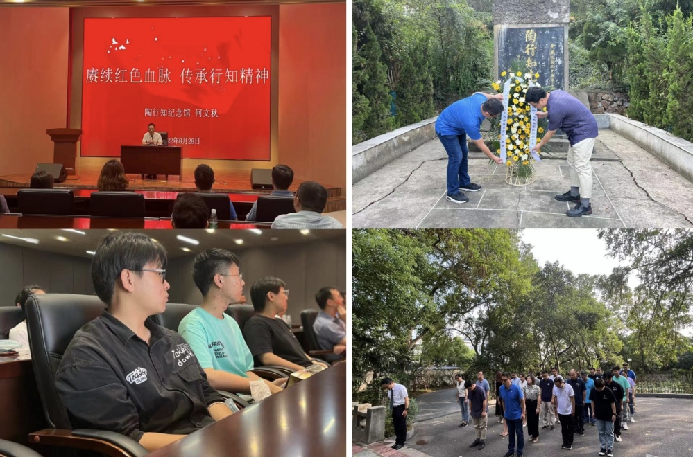 何文秋馆长做“赓续红色血脉,传承行知精神”专题党课,讲述在晓庄学院这所具有红色基因学校,英烈们为中华民族奋勇抗争的故事。随后,大家来到了伟大的人民教育家陶行知先生墓前进行祭拜,在英雄纪念碑前敬献花篮,缅怀为革命牺牲生命的晓庄十英烈。