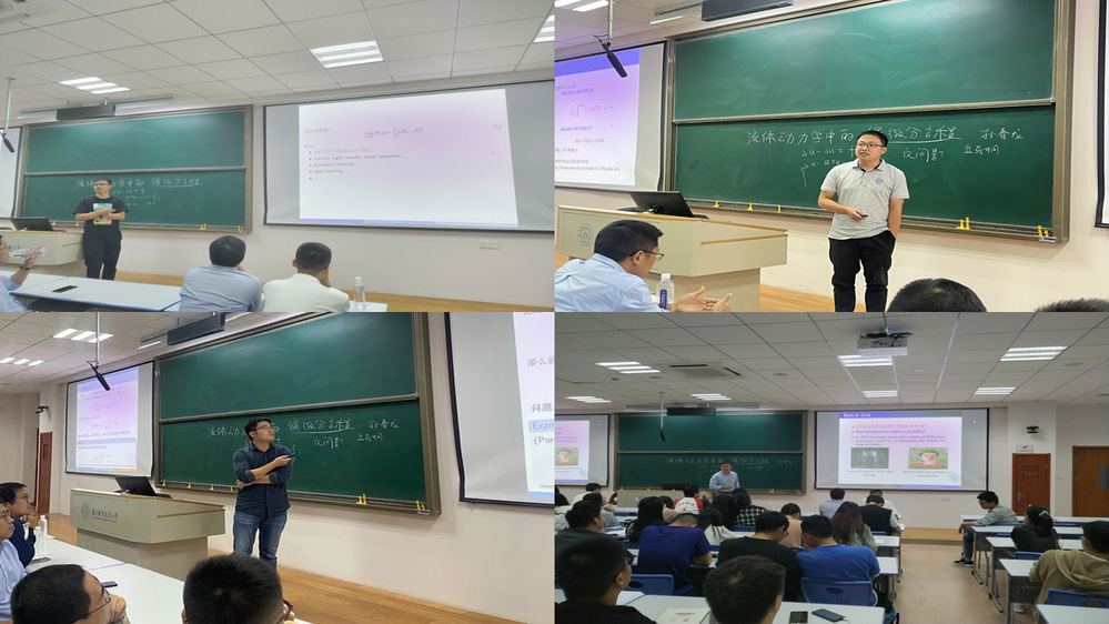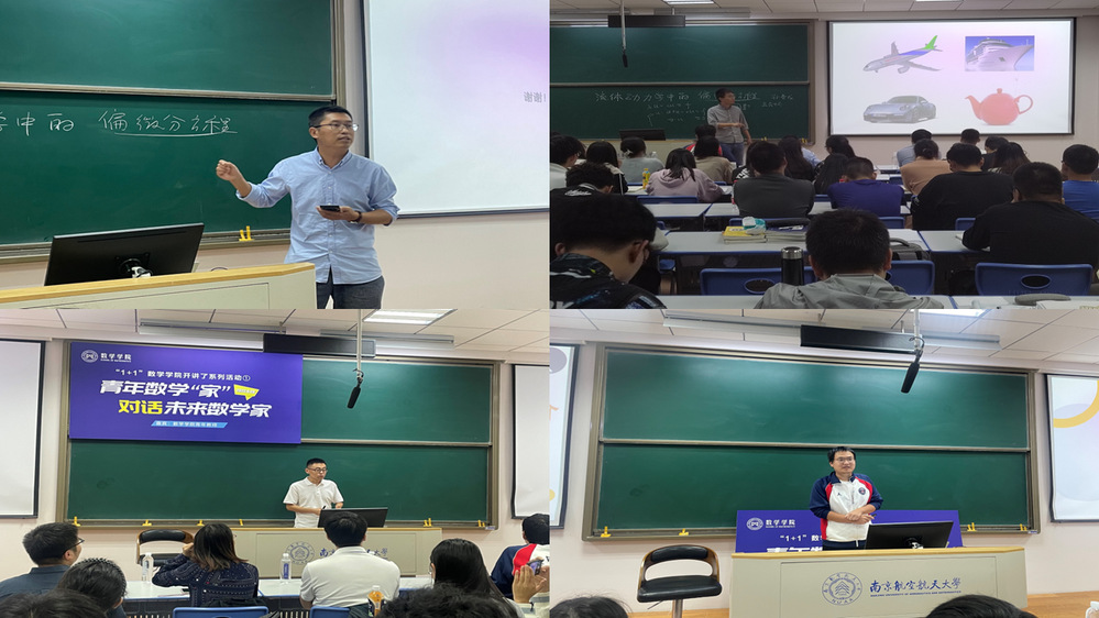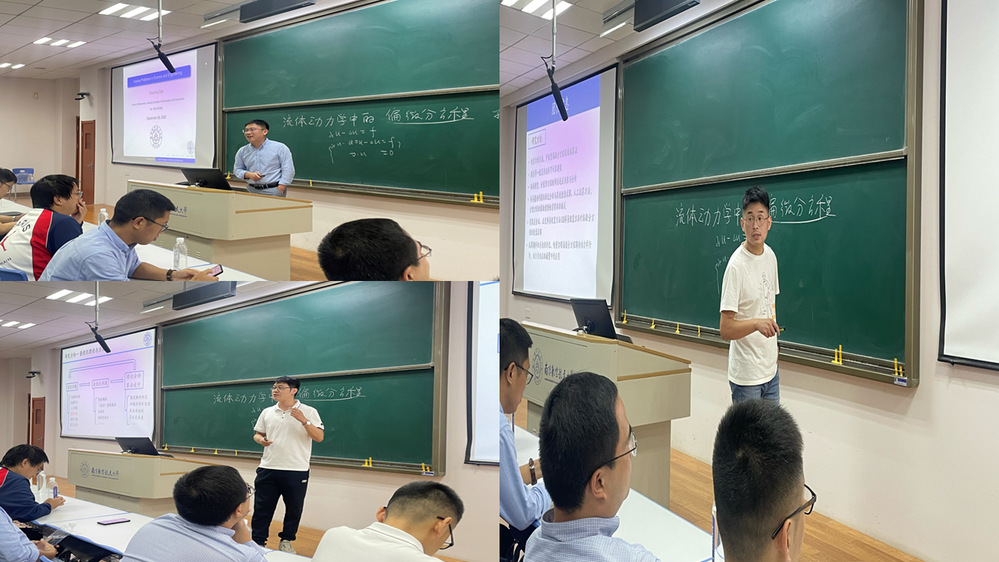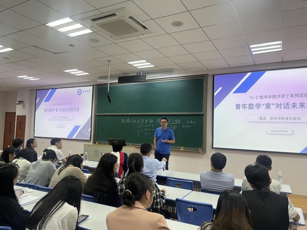 潘茂东介绍,青年数学“家”的各位老师在自己的领域都做得很好,此次面对面的交流,既是向同学们介绍自己的研究内容,也是希望通过交流,和同学们共同领略数学魅力。欢迎同学们多提问题,主动参与老师的科研项目,在交流中寻找兴趣点。随后,先后进行数学系、计算科学系、概率统计系青年教师宣讲。每部分结束之后,同学畅所欲言,就感兴趣的内容与老师们充分交流。数学系青年教师潘星宏、娄兆伟、龙波涛、孙英男、高风双介绍了流体力学中的偏微分方程、动力系统等科研项目;计算科学系青年教师龚跃政、潘茂东、高益铭、唐与聪、洪旗、孙春龙、孔旺介绍了偏微分方程数值解、计算几何、图像处理、航空运输优化、反问题等科研项目;概率统计系青年教师余迁、索永强、陈鹏介绍了随机分析与随机过程、金融分析等科研项目。老师们结合个人研究内容和对数学的理解,深入浅出,呈现了一个缤纷多彩的数学世界。