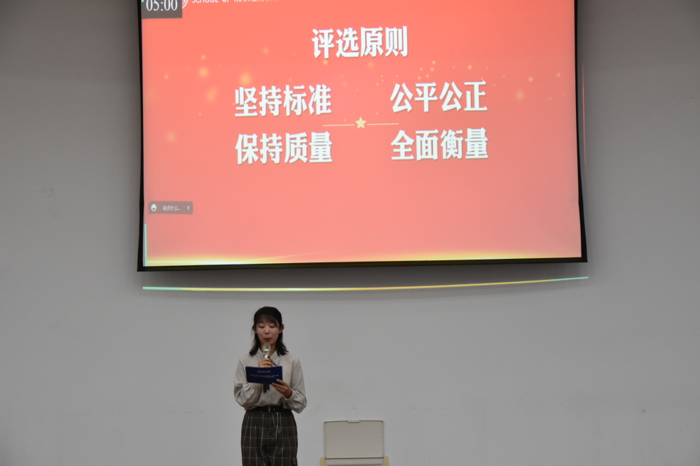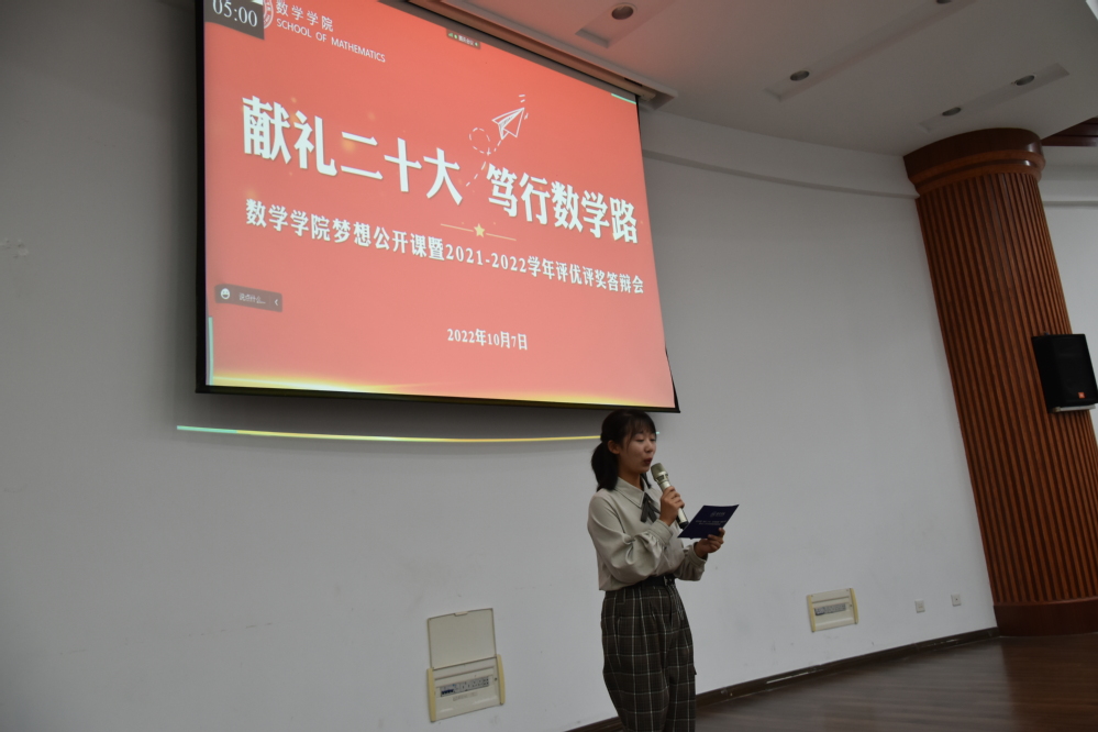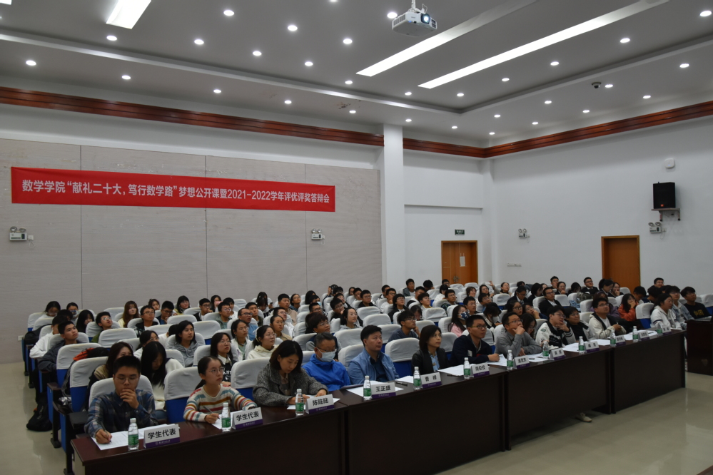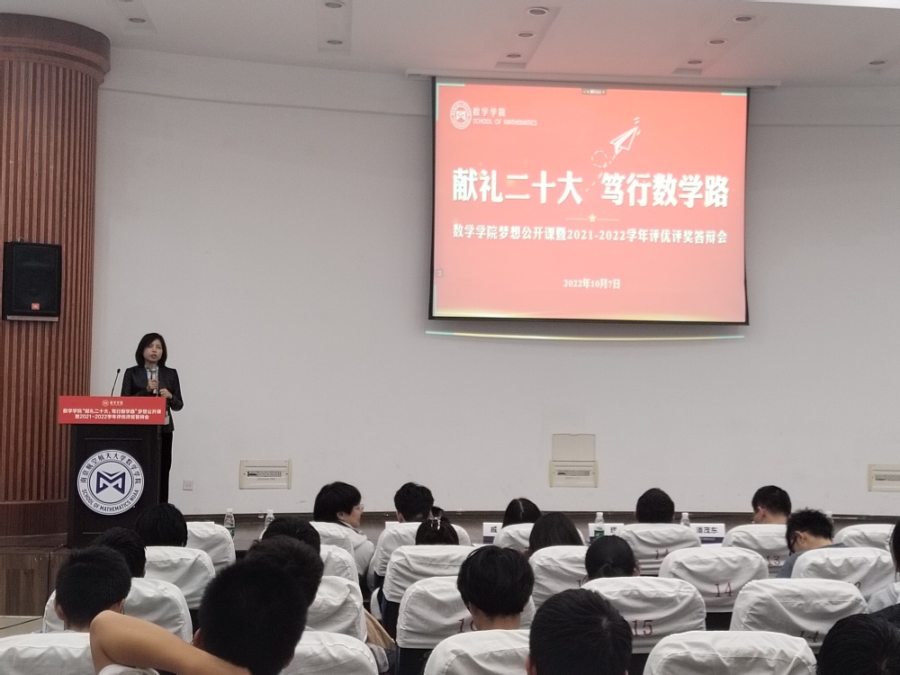 二十大即将到来之际,为了充分发挥榜样育人作用,用身边的榜样激励更多同学见贤思齐、矢志奋斗。10月7日晚7点,英国上市365于理学楼报告厅举办“献礼二十大,笃行数学路”梦想公开课暨2021-2022学年评优评奖答辩会,参加此次活动的评审有英国上市365党委副书记周佼佼,院长助理、0822101班班主任潘茂东,信息与计算科学专业负责人王正盛,应用统计学专业负责人蒋辉,数学系系主任曹峰,教学办主任陈陆陆,团委书记戚月,2019级辅导员胡诗帆,2020级、2022级辅导员陈越及两名学生代表。活动由学院2022级新生闻敏含主持,2022级全体本科生到场学习。