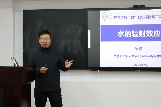 正式报告前马骏教授回忆了自己在法国求学工作时与数学家们交往的一些趣事,随后他做题为《水的辐射效应》的学术讲座。马教授首先介绍了水的辐射效应历史、我国的核能发展以及日常生活中被核辐射过的食品。接着他详细讲解了水辐射效应的研究方法以及这其中所涉及的数学问题,包括偏微分方程数值解、蒙特卡洛模拟、多尺度建模等。最后,马教授就数学与材料科学的融合谈了一些看法,认为材料科学中的数学问题无处不在,许多难题的研究迫切需要数学工作者的参与。