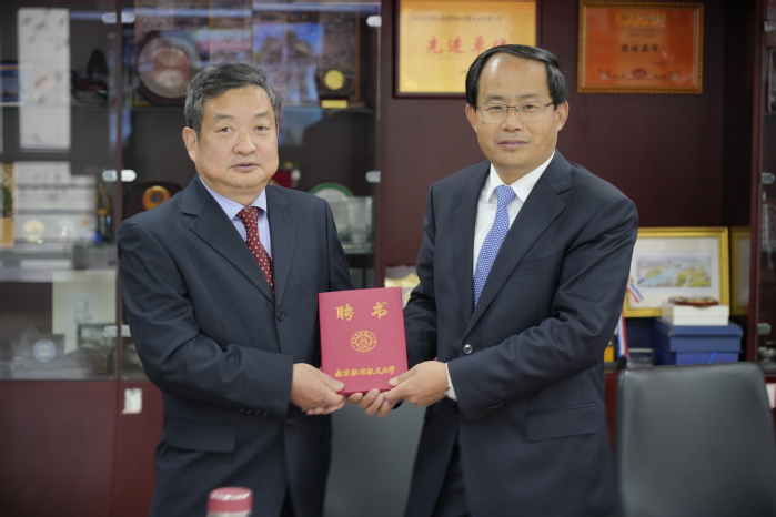 随后,单忠德代表学校为林杉颁发名誉教授聘书及校徽,曹喜望代领。