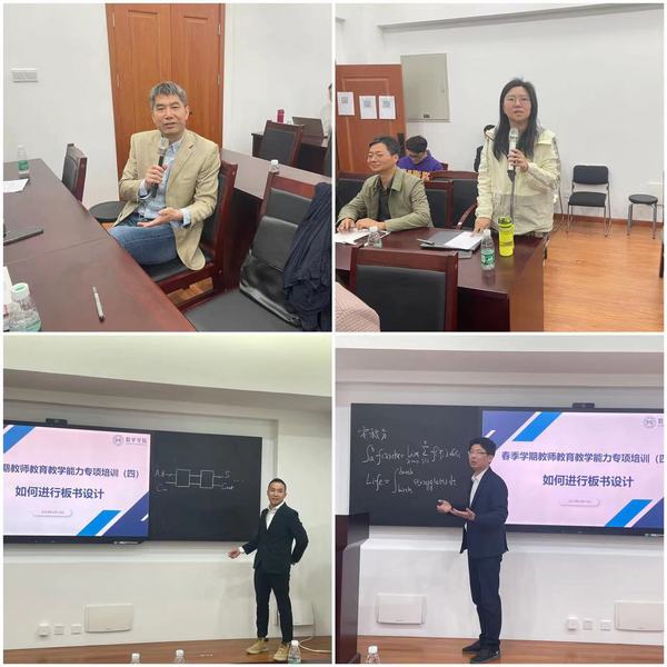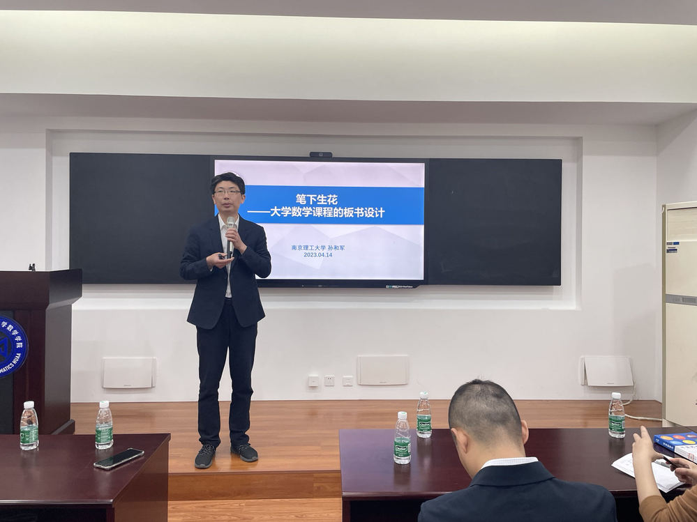 在培训讲座中,孙和军老师结合自身实例,生动富有情感地从大学数学课程教学的背景和问题、大学课堂教学设计原则和方法、教学板书的内涵和意义、数学板书的设计原则和方法等角度分析了大学数学课程的板书设计。