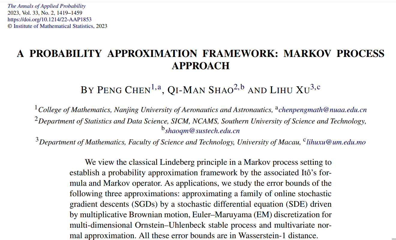 日前,我院概率统计系教师陈鹏及其合作者在概率统计顶级期刊《The Annals of Applied Probability》上发表了题为“A Probability Approximation Framework: Markov Process Approach”的研究论文。