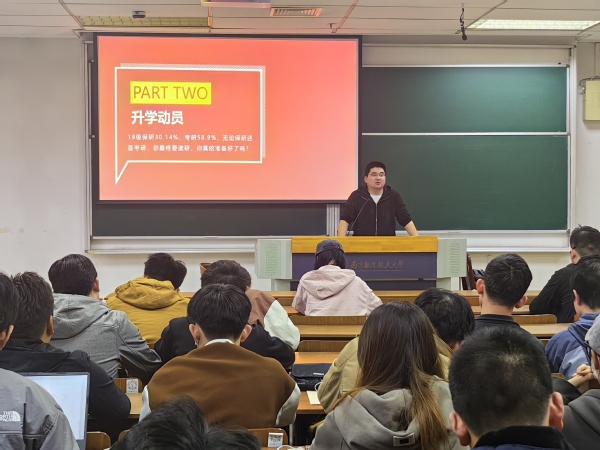 陈越围绕升学就业两个关键词,从学生成绩、学习状态出发,指出了20级学业上的优势和不足,并通过分析毕业生升学就业情况,对相关数据进行纵向对比,建议同学们对标自身能力,合理确定升学目标。就业方面,他重点强调了提前规划的重要性、对如何进行规划做了具体指导。此外,他预告了学院职业素质训练营的详细安排,为同学们升学就业保驾护航。