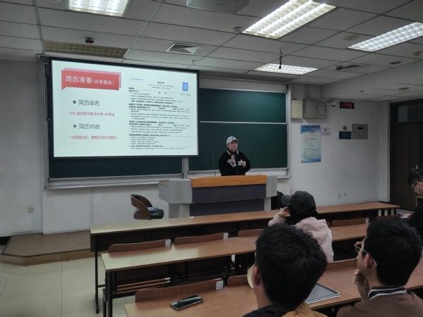胡诗帆作为连续两届毕业班辅导员,着重为同学们介绍了当前就业市场的形势、特点,建议同学们未雨绸缪,提前准备。此外,他还就往届同学中常见的就业困难向20级同学发出预警,建议针对性进行知识准备和能力积累。