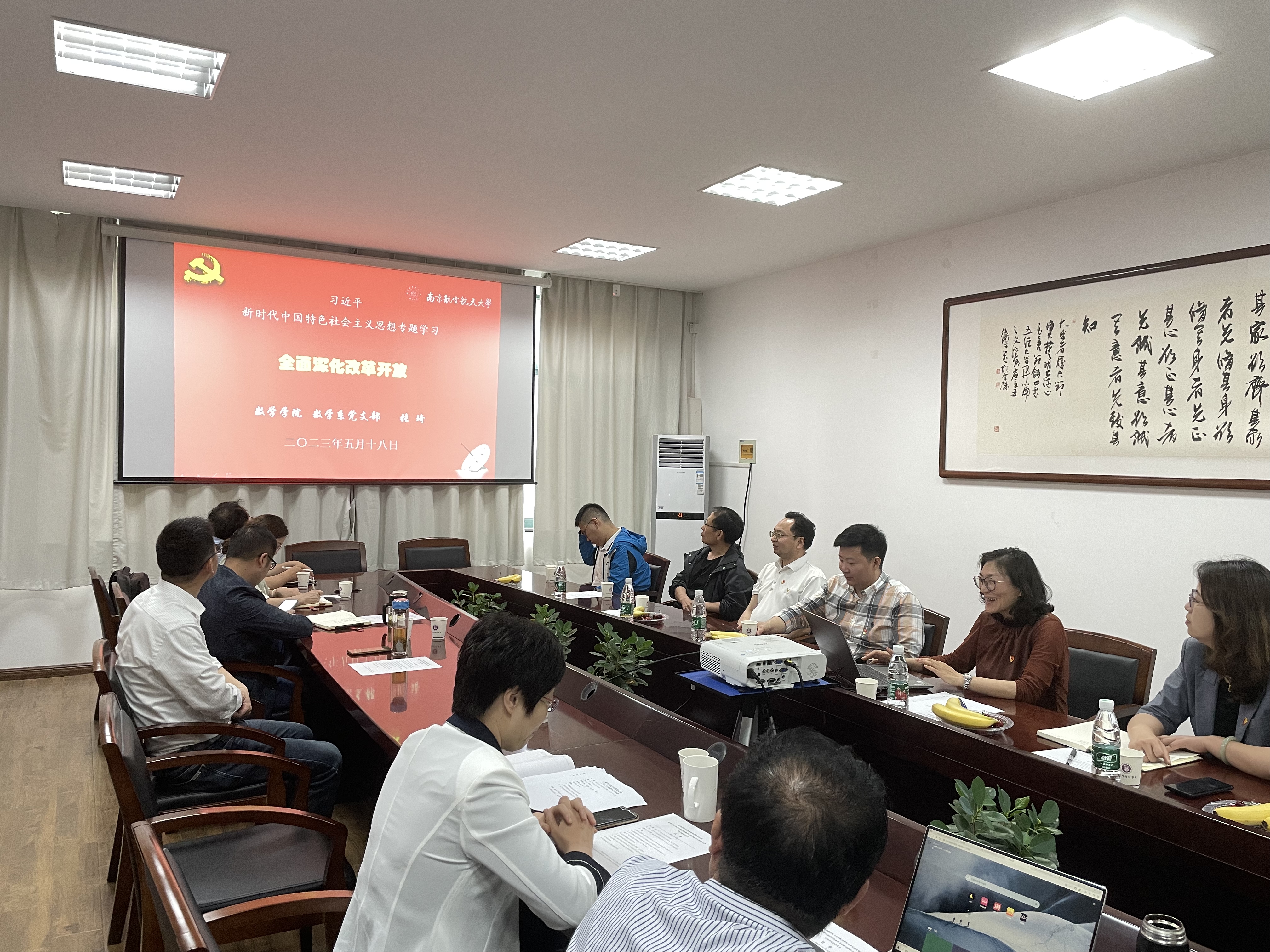 结对共建作为加强学习交流的重要平台,南航数学系党支部书记张琦领学、支部联学了《习近平新时代中国特色社会主义思想专题摘编》第七章——《坚持全面深化改革》。南理工许春根教授、南航曹喜望教授代表双方支部分享学习体会,就两校学院历史沿革、教育教学、理工融合等方面交流经验。