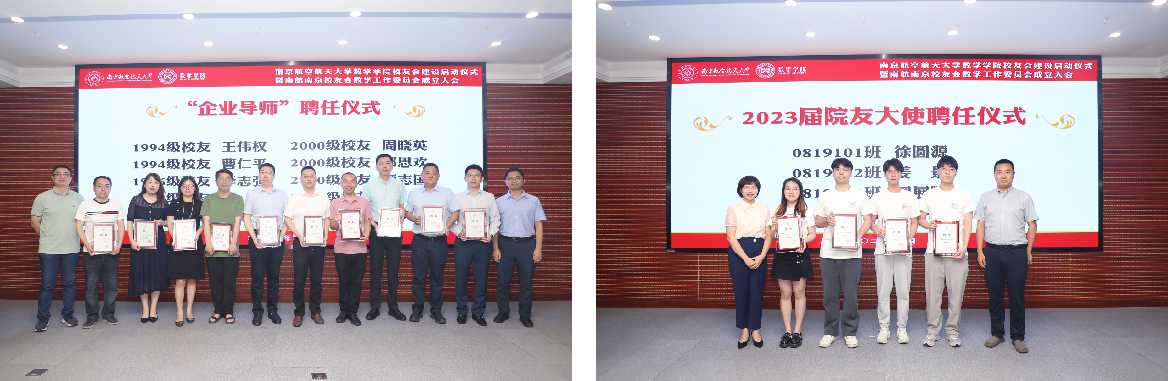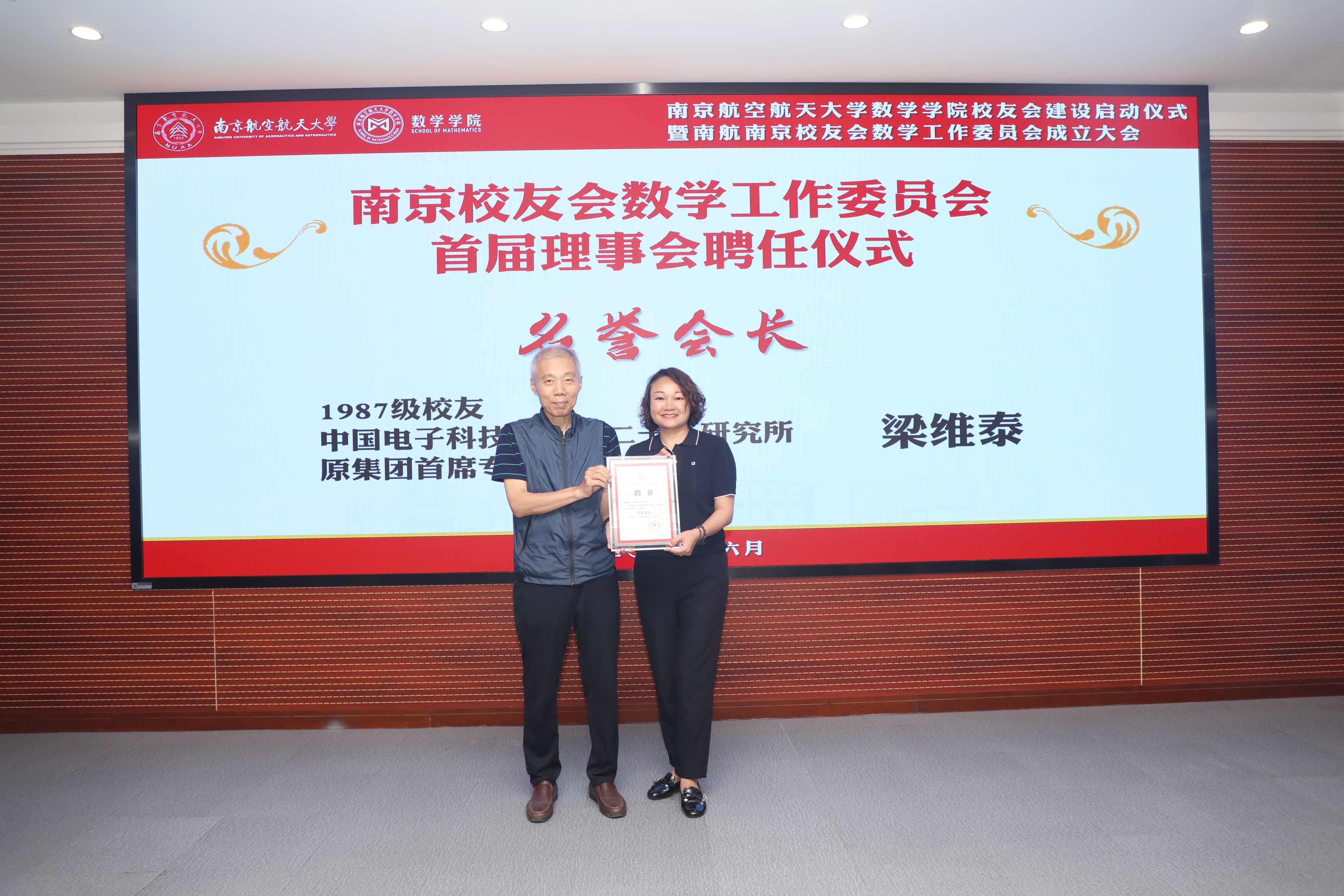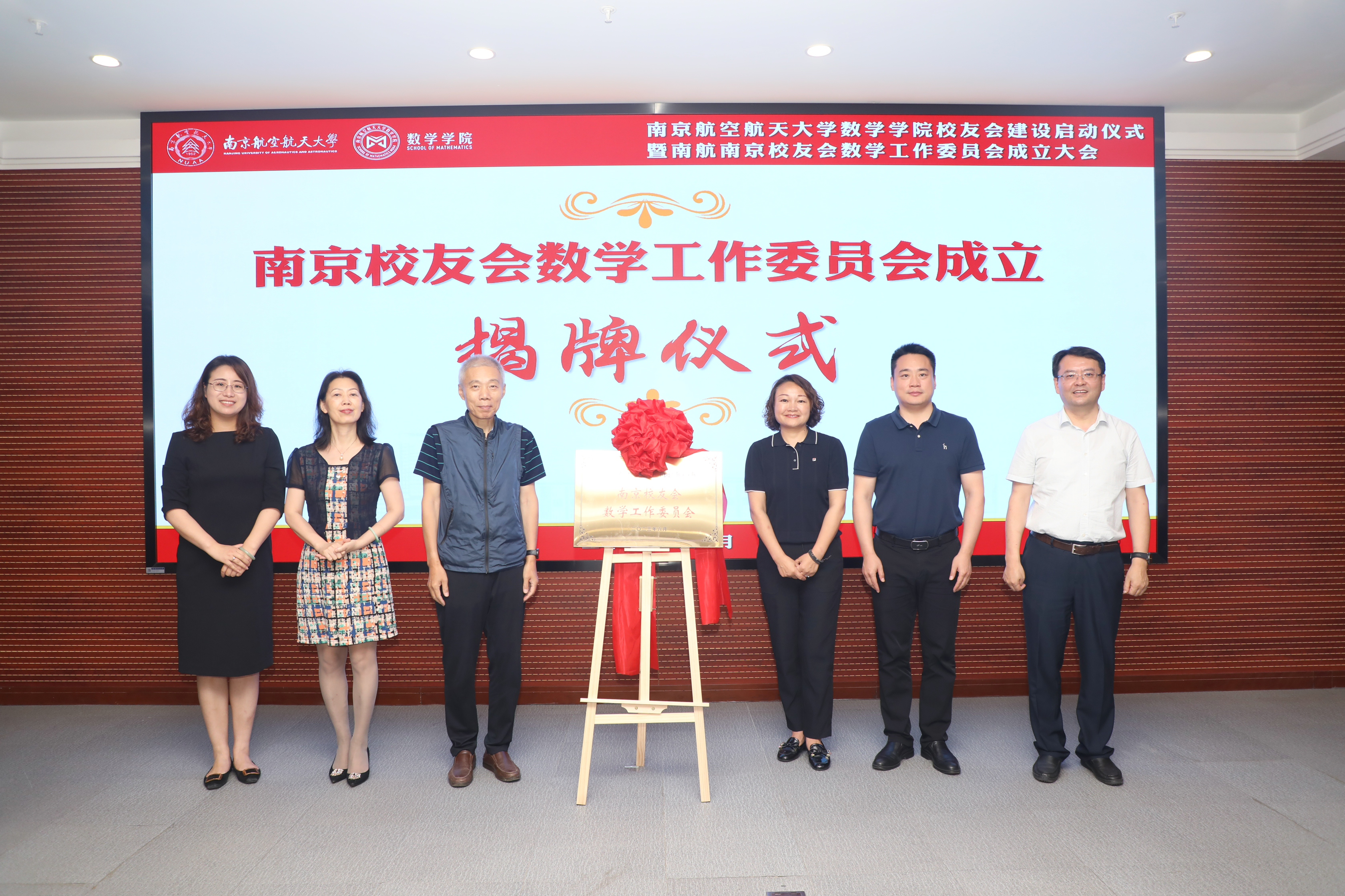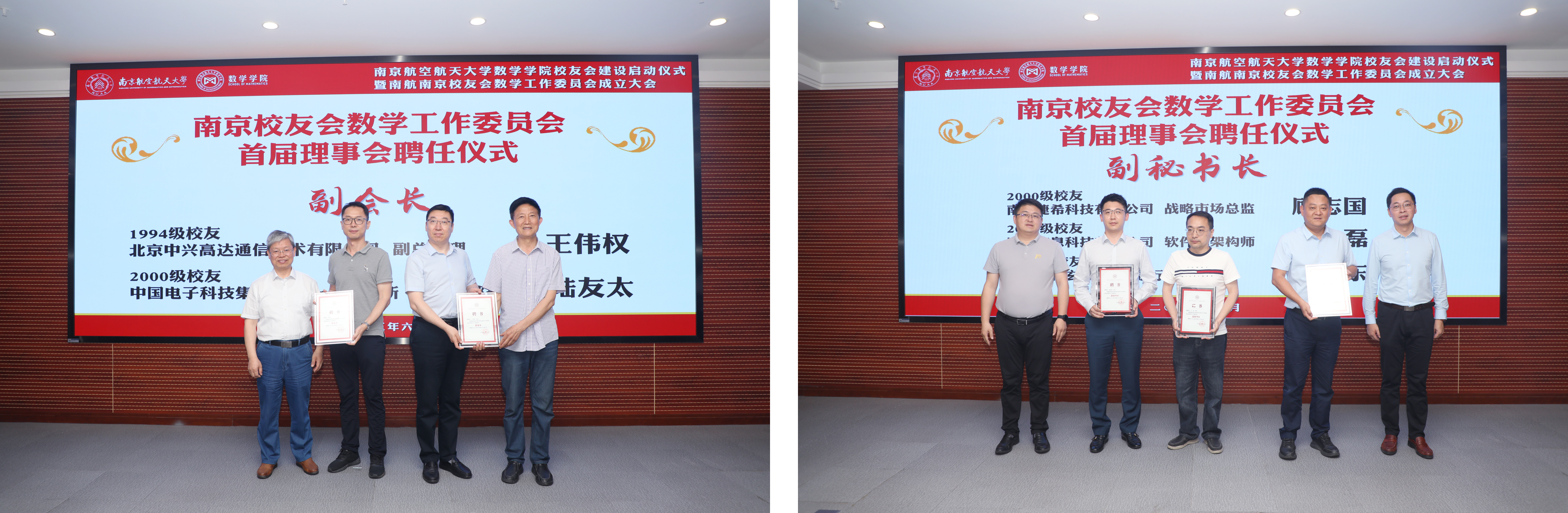 王晖、梁维泰、邓丽芸、李和新、许静、王春武共同为南京校友会数学工作委员会揭牌。王晖为数学专业1987级校友、中电28所原集团首席专家梁维泰颁发名誉会长聘书,学院老领导倪勤、戴华为1994级校友、北京中兴高达通信技术有限公司副总经理王伟权,2000级校友、中电28所军工二部部长陆友太颁发副会长聘书,许爱华、张林为2000级校友、南京捷希科技有限公司战略市场总监顾志国,2001级校友、库瀚信息科技有限公司软件部架构师王磊,2007级校友、中国银行玄武支行副行长姚晓东颁发副秘书长聘书。