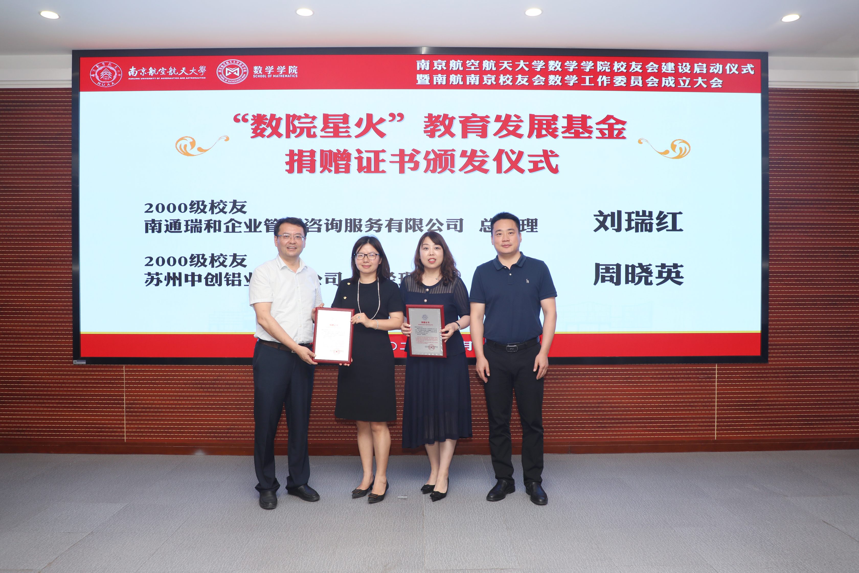 在院友的支持助力下,学院设立了“数院星火”教育发展基金。会上进行了捐赠证书颁发仪式,李和新、王春武为首批捐赠者2000级校友、苏州中创铝业有限公司总经理周晓英,南通瑞和企业管理咨询服务有限公司总经理刘瑞红颁发捐赠证书。