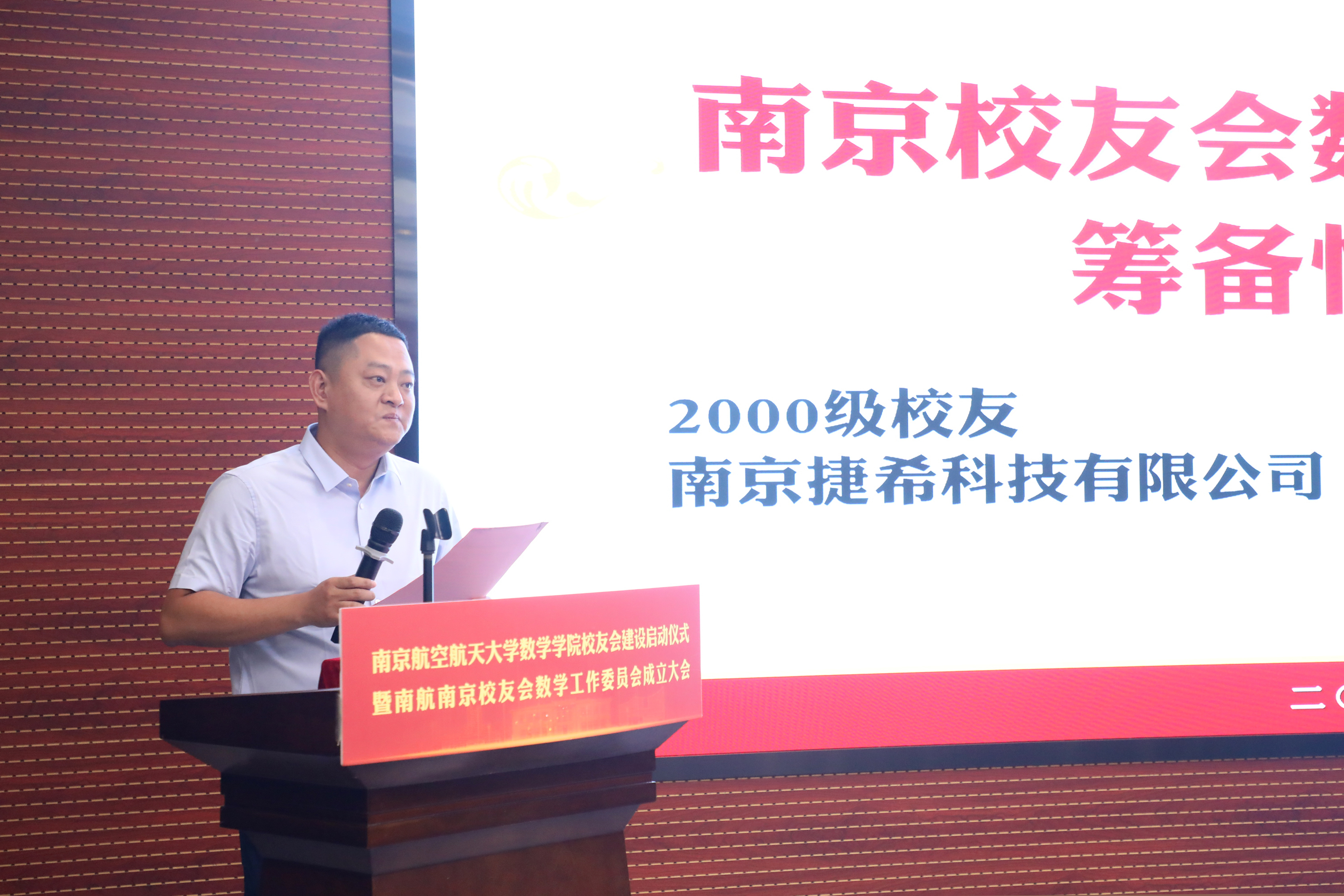 随后进行南京校友会数学工作委员会成立仪式及首届理事会聘任仪式。学院2000级校友、南京捷希科技有限公司战略市场总监顾志国代表南京校友会数学工作委员会筹备工作组作了筹备工作报告。