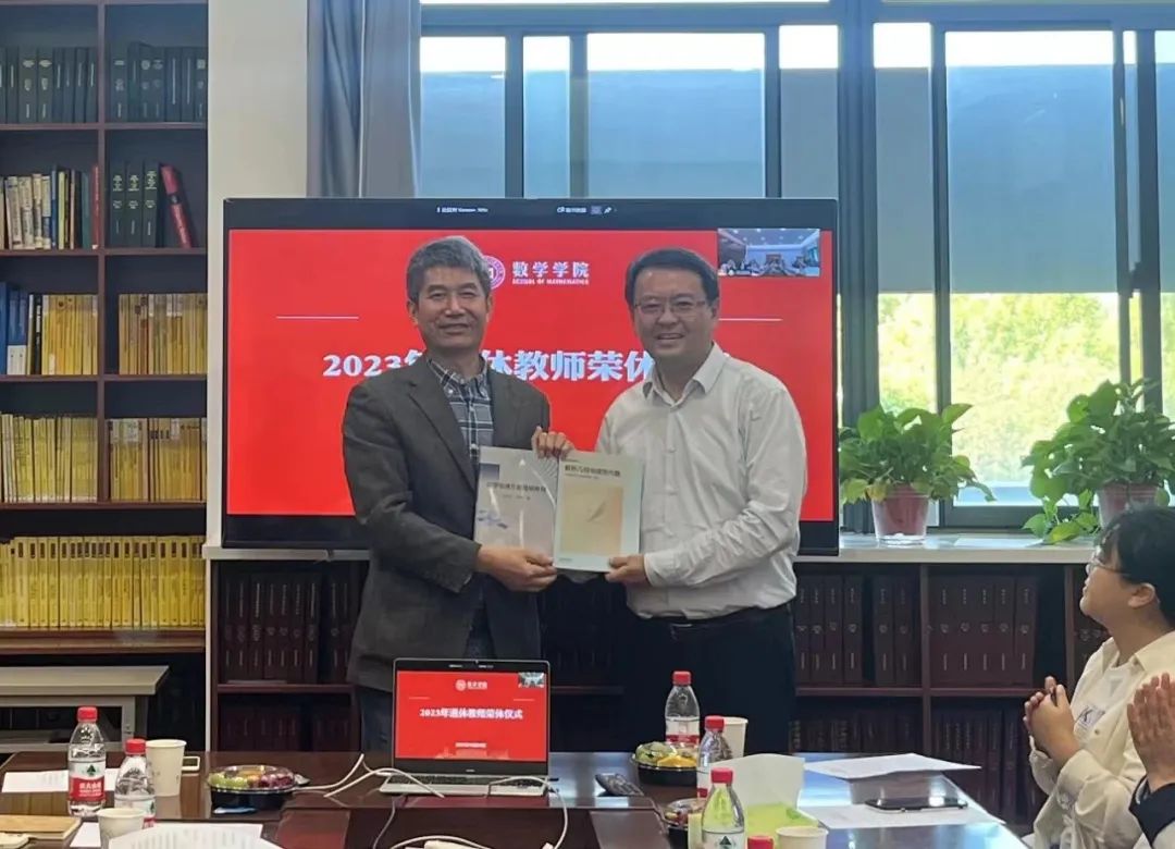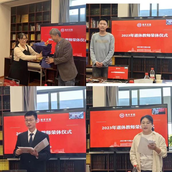 张鲁明和曹荣美深情回顾了三十多年的工作经历和成就,他们表示教育学生是工作职责,辛苦但是甘之如饴,学院同事如同家人,祝愿学院和老师们越来越好。为鼓励年轻人继续创新,传承教书育人的精神和使命,张鲁明和曹荣美向学院分别赠送自编教材《数学物理方程简明教程》、《线性代数与几何》。曹荣美以《我最喜爱的一个定理》为题,以最后一堂微课的方式分享了教学精彩片段,“教学需学习,教学需研究;教学是学术,教学是艺术”,表达了对青年教师的厚望,鼓励青年教师继承并发扬学院的优良传统。
