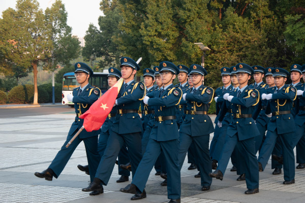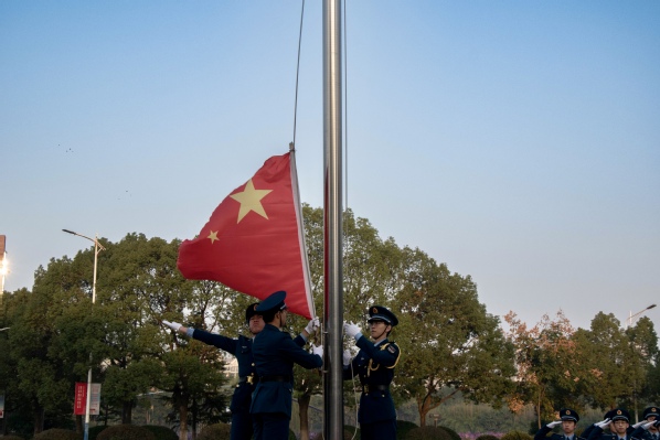 上午七点整,升旗仪式正式开始。在全体师生的注视下,国旗班迈着整齐划一的步伐护送鲜艳的五星红旗入场。伴随着庄严肃穆的《义勇军进行曲》,五星红旗冉冉升起,全体师生目视国旗,高唱国歌。