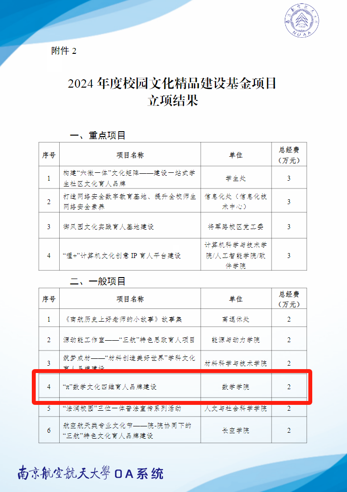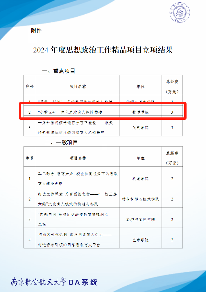 近日,我校党委宣传部发布了《关于公布2022年度校园文化精品建设基金项目验收和2024年度校园文化精品建设基金项目立项结果的通知》《关于公布2024年度思想政治工作精品项目立项结果的通知》,经过自主申报、单位推荐、专家评审、立项公示等环节,我院2022年度校园文化精品建设基金项目《“同心筑梦”中华民族共同体教育校园文化情境建设》通过验收,我院申报的《“π”数学文化四维育人品牌建设》获2024年度校园文化精品建设基金项目一般立项,我院申报的《“小数点+”一体化思政育人矩阵构建》获2024年度思想政治工作精品项目重点立项。