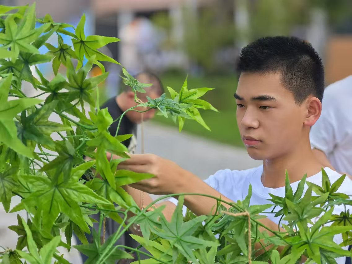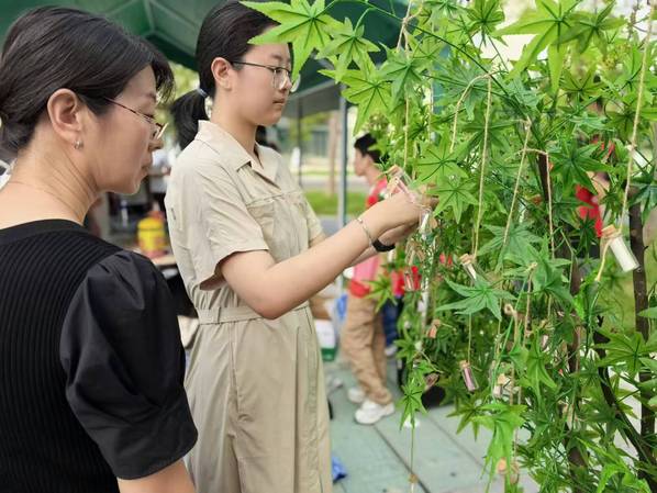 迎新现场,学院特地安排了心愿树,每位新生都可以将自己的心愿写下装进许愿瓶里,亲手悬挂于小树上,每一张小纸条都承载着同学们的青春梦想在阳光下闪烁着耀眼的光芒,收获了满满的仪式感。