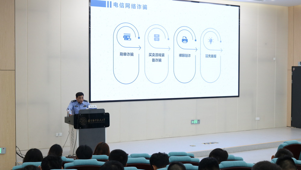 周立群从人身安全、财产安全、网络安全、毒品安全四个方面,全方位介绍了高校学生常见的一些安全问题,通过一系列生动鲜活的案例,重点强调了校园暴力、电信网络诈骗、两卡犯罪、新型毒品的危害等。周警官以生动形象的案例和深入浅出的讲解,为学生带来了一场内容丰富、实用性强的讲座。