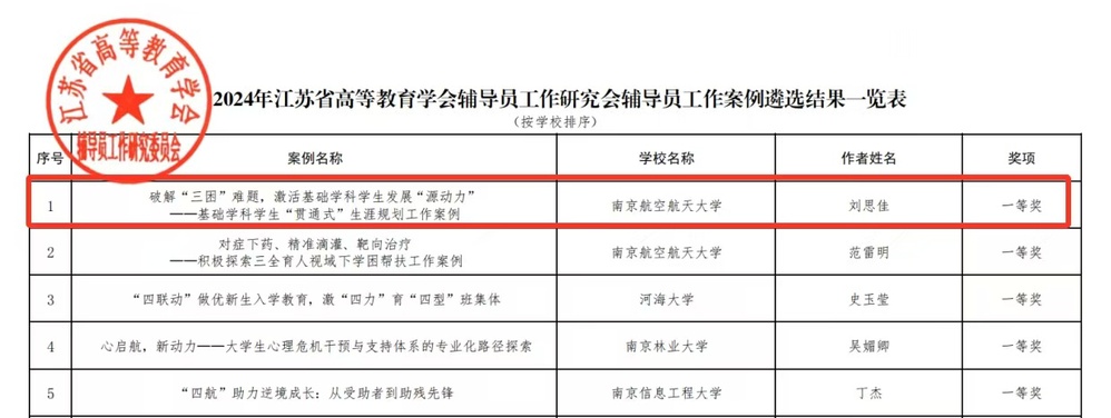 近日,江苏省高等教育学会辅导员工作研究委员会公布2024年度辅导员工作案例遴选结果,我院本科生辅导员刘思佳撰写的工作案例《破解“三困”难题,激活基础学科学生发展“源动力”——基础学科学生“贯通式”生涯规划工作案例》荣获江苏省辅导员工作案例一等奖。