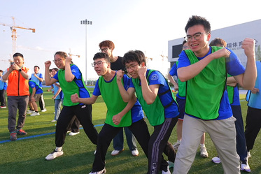 开场环节气氛热烈,师生们混合组成5支参赛队伍。各队在破冰环节集思广益,制定出创意十足的队名和响亮的口号。随后,全体人员跟着教练进行热身,通过团队协作完成指定动作,现场欢声笑语不断。