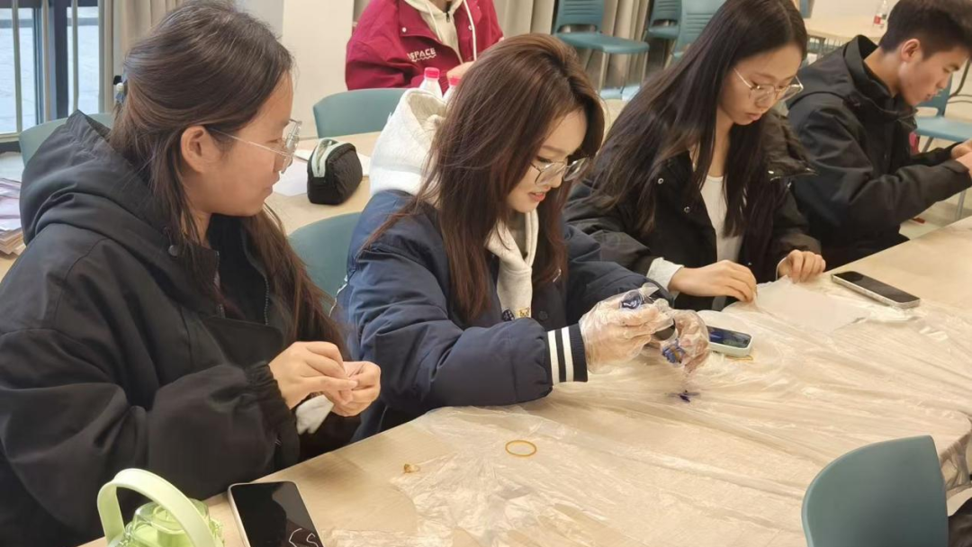 开场环节,白族同学虞双阳奏响竹笛《彩云之南》,悠扬乐声婉转流淌,瞬间将在场师生带入丽江古城的青石板路、苍山洱海的湖光山色之中。互动体验时,各族同学围坐一堂,创作扎染手帕、共品醇厚普洱、细尝清甜鲜花饼,氛围热烈融洽,尽显云南温润多彩。
