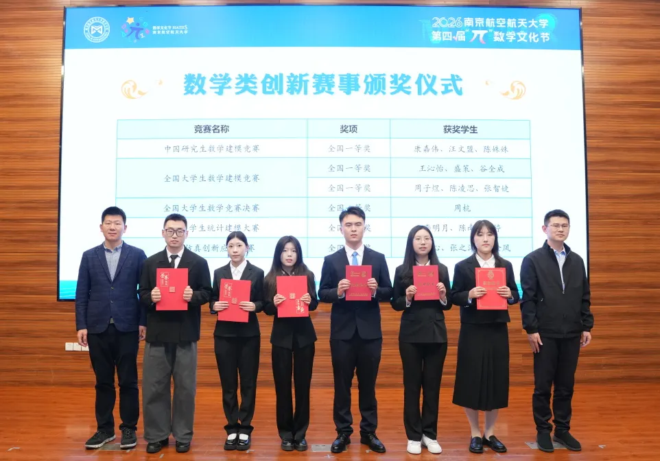 过去一年,南航学子在各项数学类赛事中奋勇争先、斩获佳绩,现场举行了数学赛事颁奖,校团委书记董羽、研究生院副院长刘向雷为获奖同学代表颁奖。中国研究生数模竞赛全国一等奖获奖者、民航学院博士生康嘉伟作为获奖代表发言,通过分享自己在赛事道路上不断求索的故事,鼓励同学们永葆热忱,在探索与创新的道路上勇毅前行。