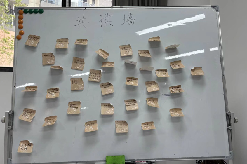 在书签漂流与共读墙创作中,大家从漂流箱中取出陌生的书签,品读他人心意,轻声交流感受。随后,同学们将金句抄在便利贴上,共同贴满白板,汇成一面共读墙,让温暖书语定格阅读记忆。