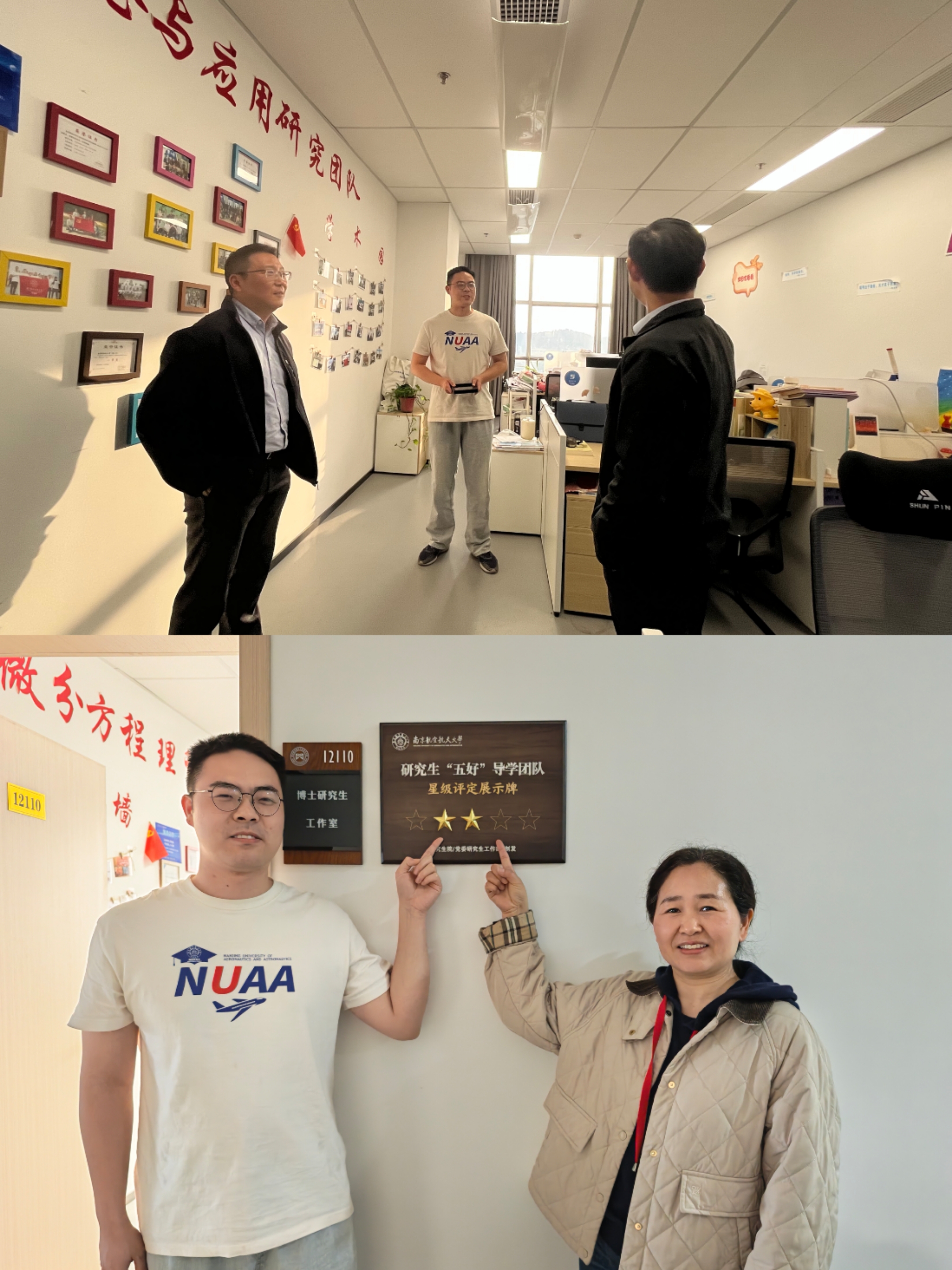 培训会结束后,学院师生共同为校级五好导学团队“微分方程理论与应用研究团队”举行了升星仪式,宋凯和张跃共同见证仪式,并实地走访了学院研究生工作室,与在场师生进行了交流。